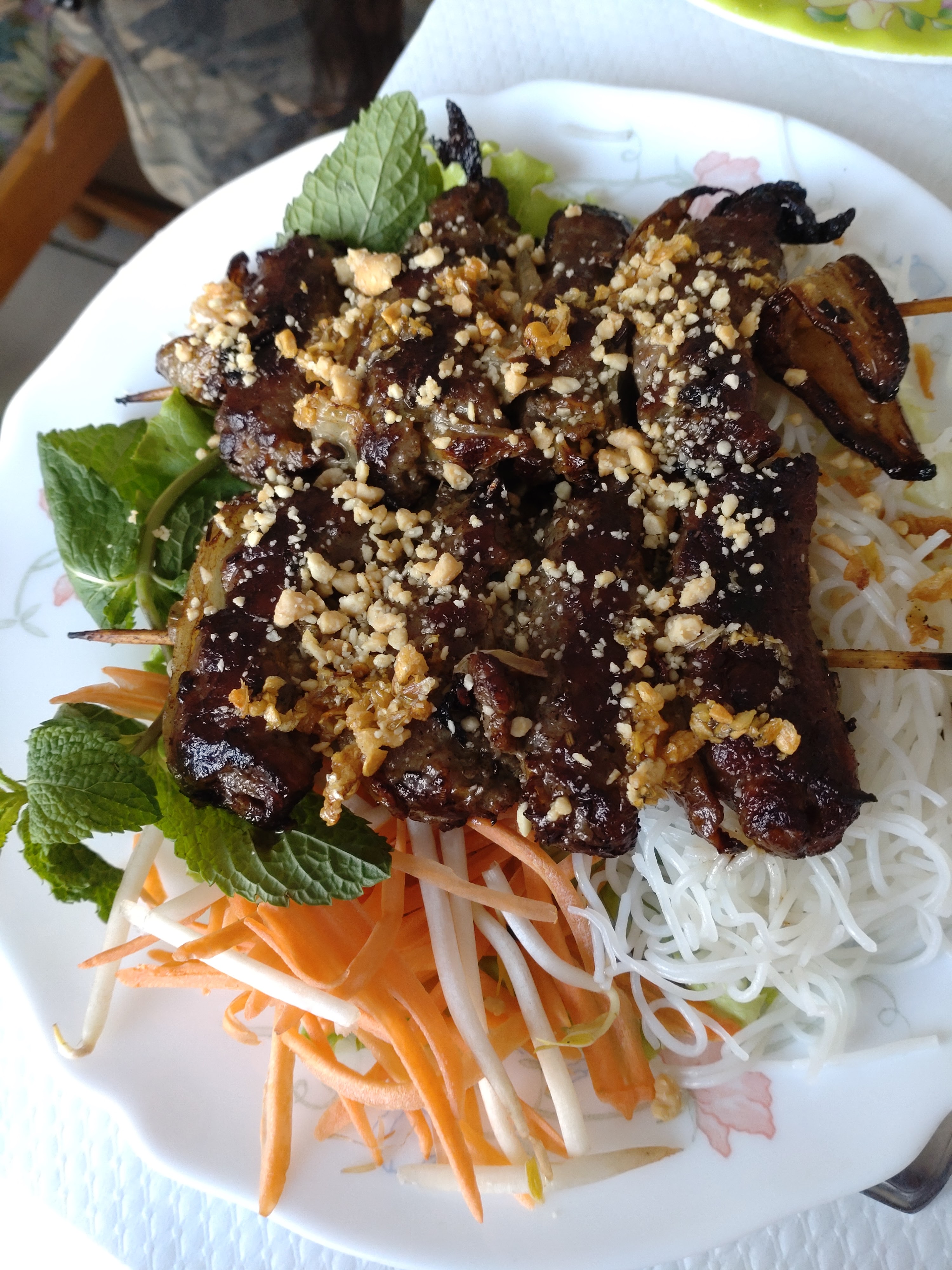 Nous avons eu au menu: en entrée rouleaux de printemps avec une sauce à tomber par terre et un plat que je ne connaissais pas, une soupe pho et des brochettes de crevettes enroulés de fines lamelles de boeuf avec des vermicelles de riz, salade, carottes râpées et menthe. C'était excellent! Le tout nous a été servi par un serveur très aimable et souriant. Une belle découverte. Je ne manquerai pas d'y revenir.