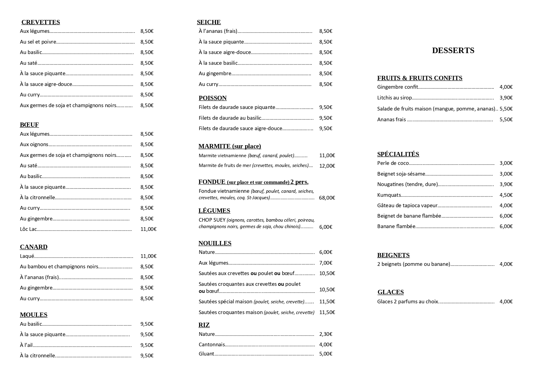 La cuisine est authentique et excellente ; je vous conseille les brioches salées banh bao ce sont les meilleurs que j’aie jamais mangées ; la soupe thaï aux crevettes est épicée à souhait avec beaucoup de crevettes et de légumes variés ; les nems sont très bons aussi ; le tout à des prix défiants toute concurrence
