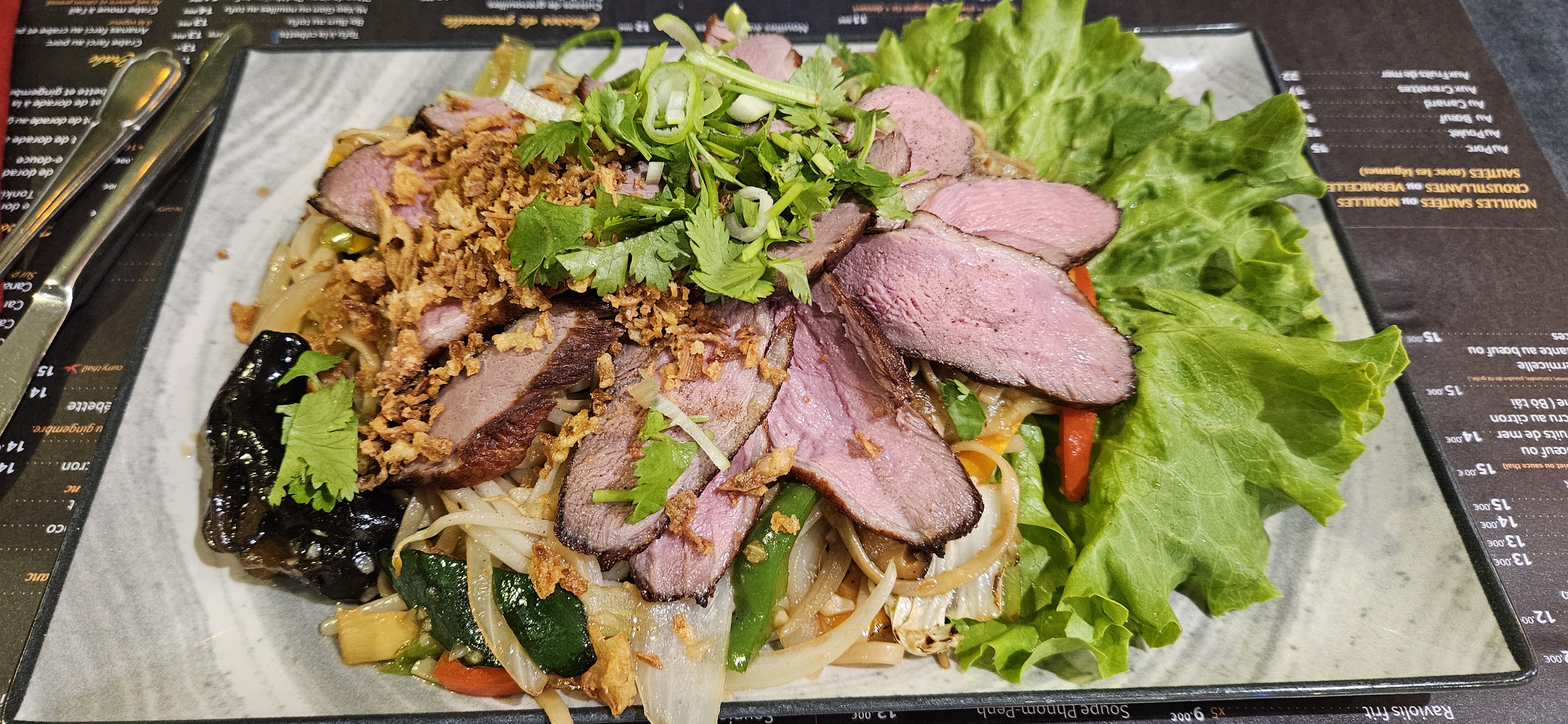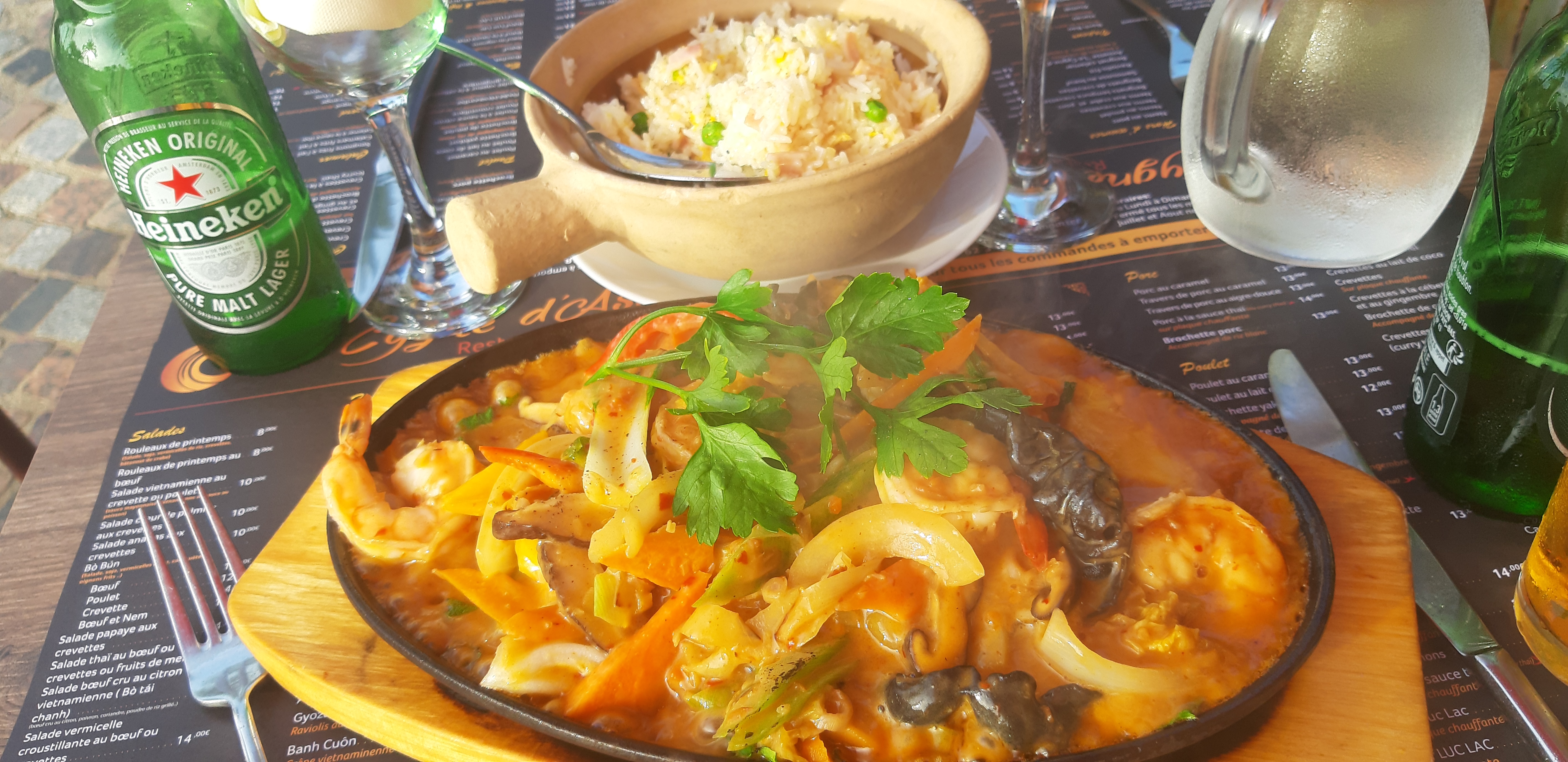 Posté le 18/01/2022 à 14:27"Tout a été excellent , une carte avec de nombreux plats en passant par les salades etc…carte en photo jointe. J’ai opté pour un bœuf sauce thaï aux légumes sur plaque chauffante qui mériterait un peu plus de viande 🥩.merci pour ce voyage de saveurs et que dire du riz thaï le tout servi copieusement. Heureusement que je n’habite pas à côté j’y serais souvent ! Nous avons passé un excellent moment dans votre restaurant et surtout MERCI aux cuisines !!👍👍🙏"