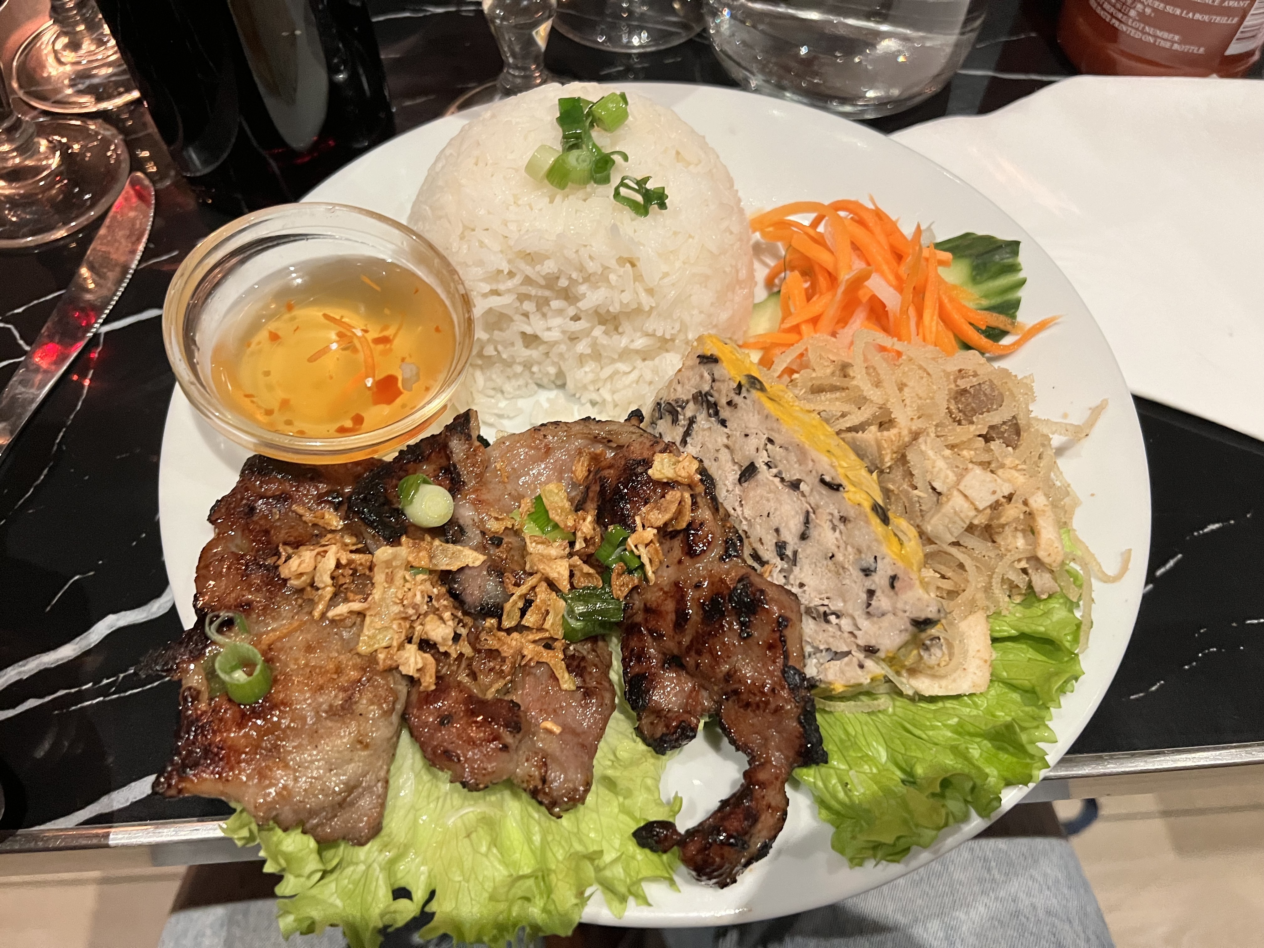Ambiance mystique trop d attente le dimanche soir je pensais que j étais dans un restaurant de la communauté gitane mais non un restaurant viet. Le lúk lák est très bon pas très copieux le serveur au yeux bleus à fuir c est un gd mlade à fuir