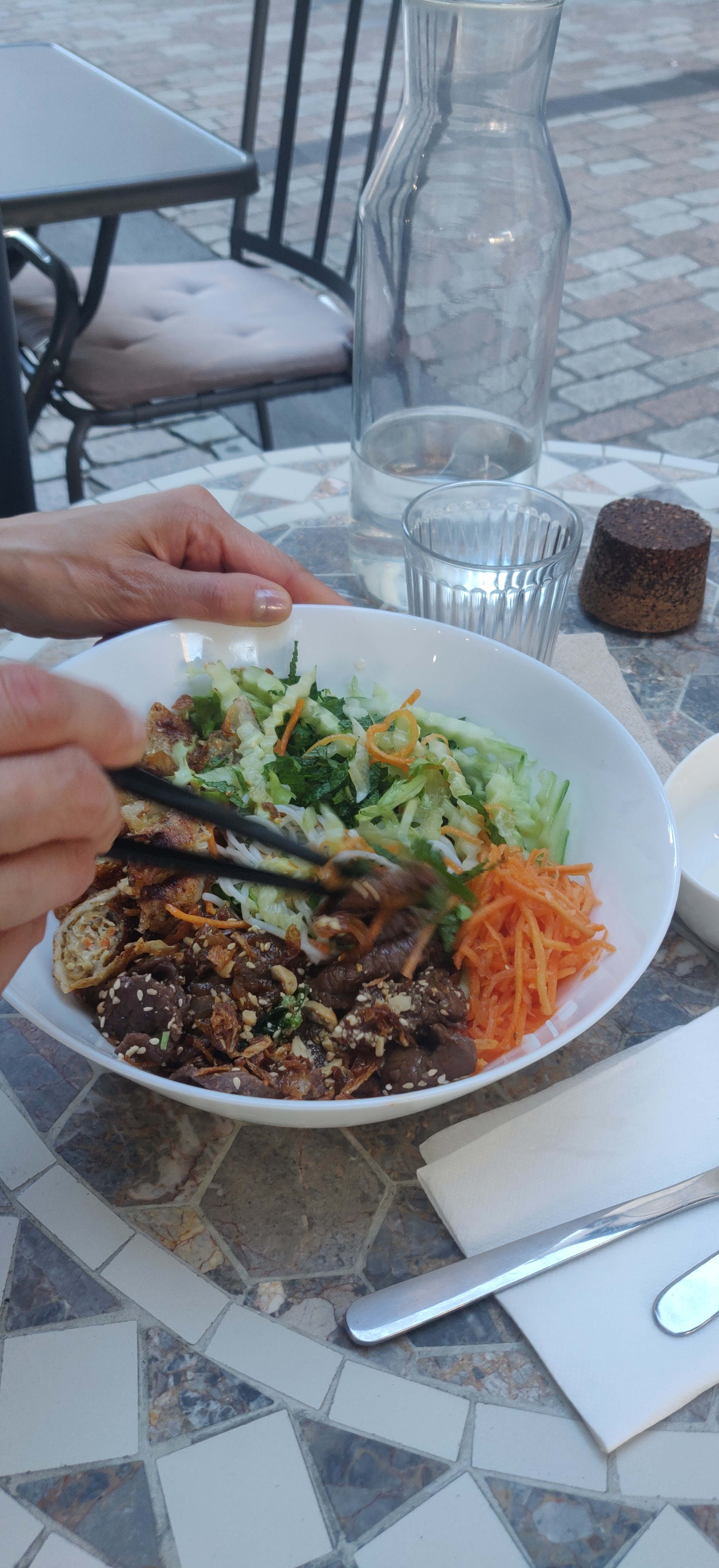 Pas le meilleur bo bun que j ai mangé Morceaux de nems un peu secs et morceaux de bœuf un peu durs Servis plus d une heure après notre arrivée Déçu et repas pas en phase avec les commentaires élogieux