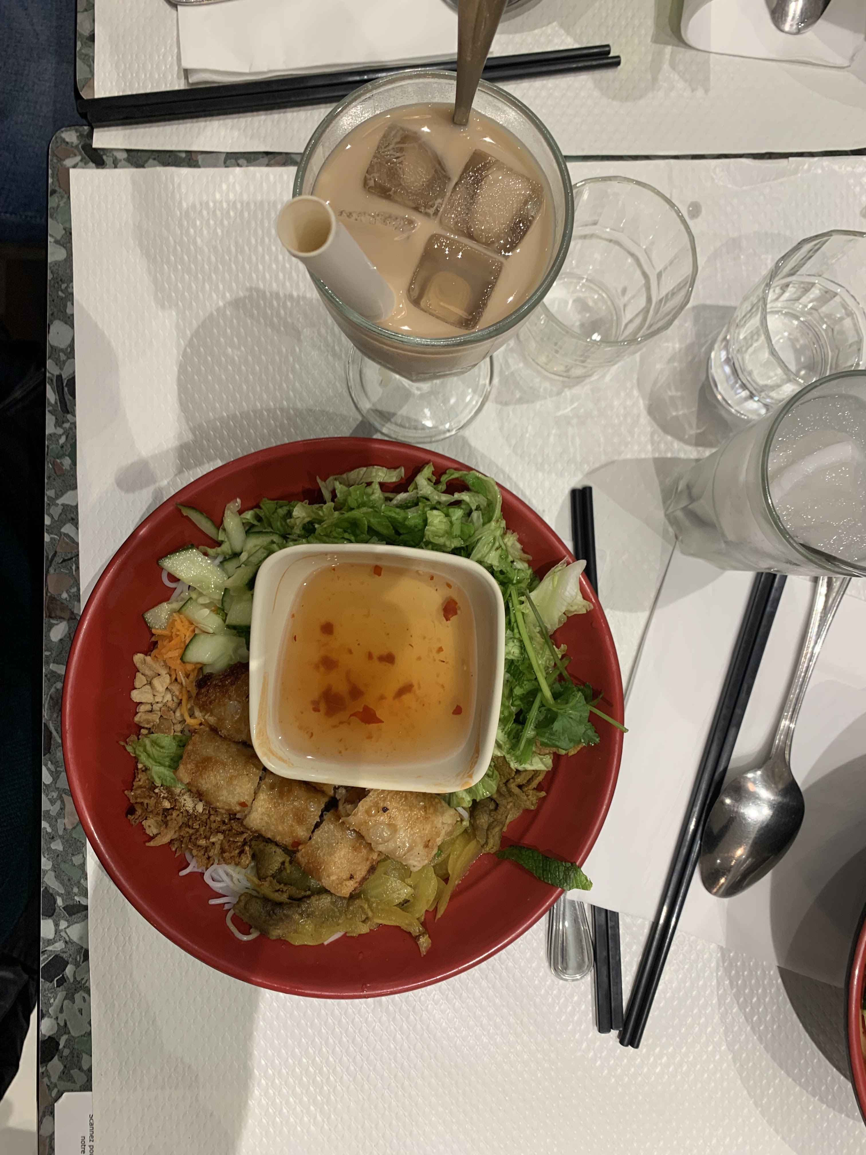 Excellent ! Une véritable surprise et un grand coup de coeur pour ce restaurant vientamien découvert par hasard. Le bò bún est excellent et généreux ; le bubble tea est également tout aussi délicieux. La salle peut sembler un peu petite et chargée en période de rush mais, malgré celà le personnel a réussi à nous trouver une table et à fournir un service plus que rapide ! Nous n'avons presque pas eu d'attente alors que le service battait son plein.