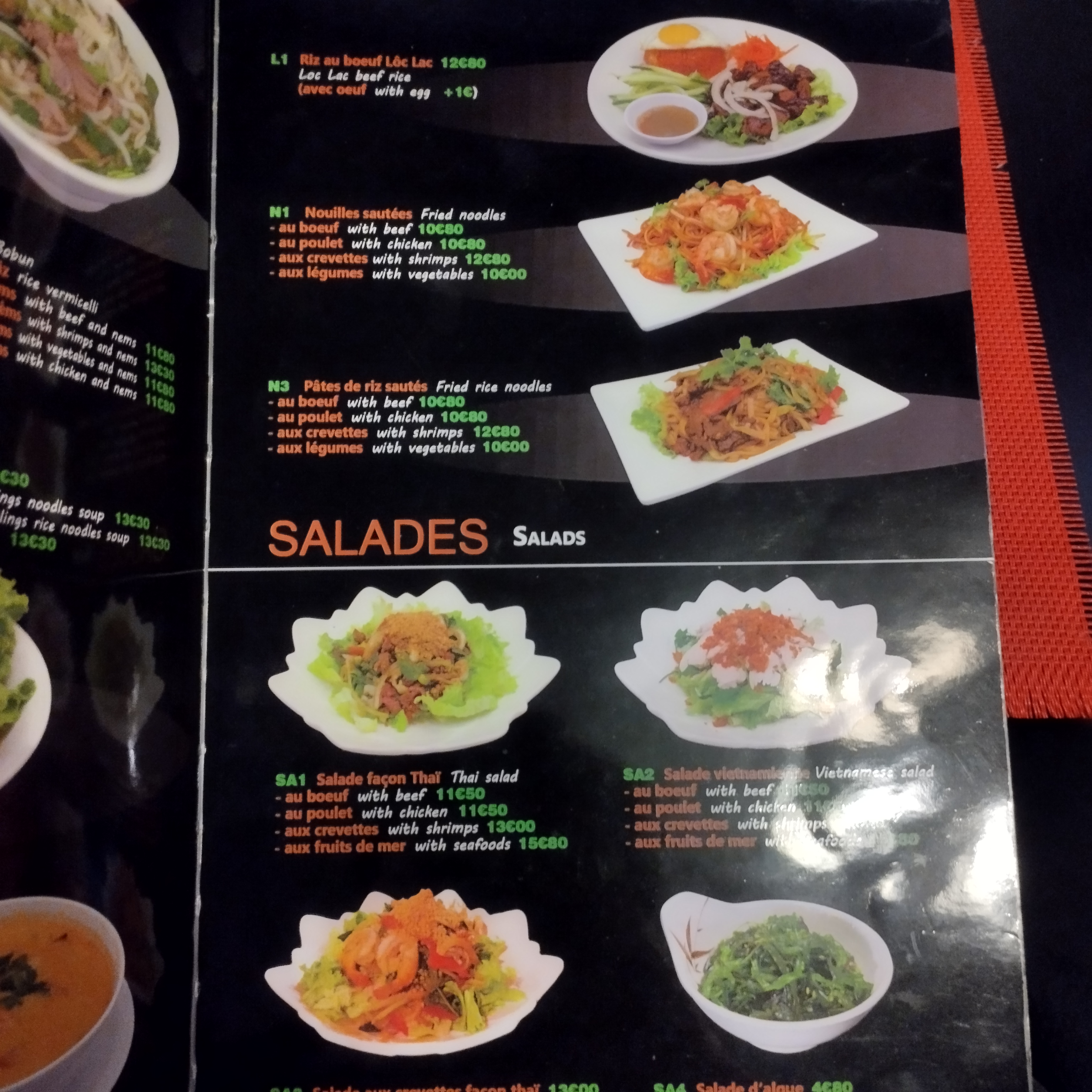 Cuisine excellente !! Je recommande particulièrement, les 2 plats testés : Bœuf Loc Lac et le Bo Bun.