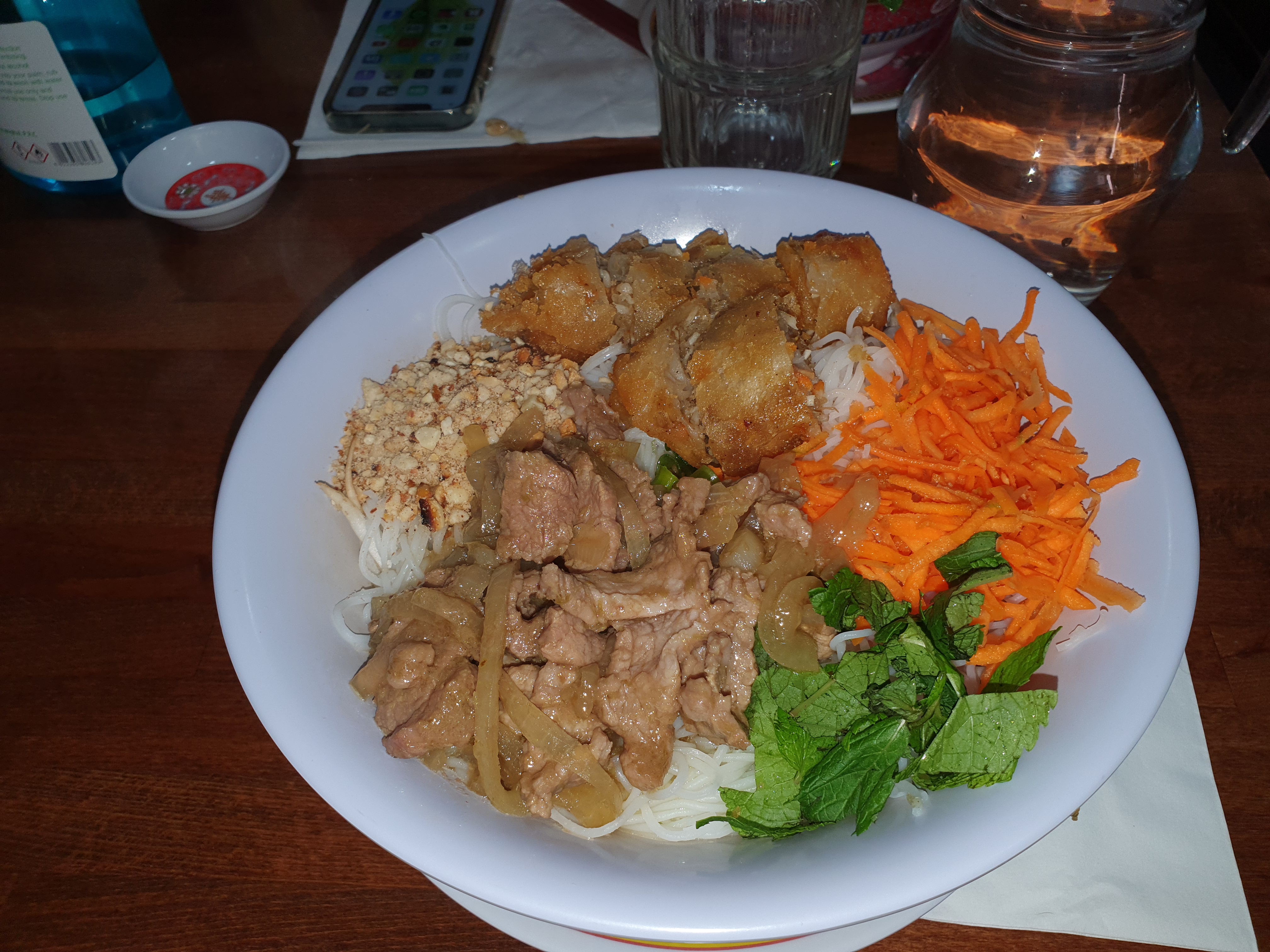 Mangeable dans l'ensemble. Néanmoins pas de goût véritablement vietnamien dans les saveurs, le pho à le goût de la poudre instantanée de la marque vifon. Les bon du bo bun sont trop fins et sec. La sauce au fond du bol est au sésame, le bœuf sauté à l'oignon au lieu de la citronnelle. On ne sent dans aucun plat la saveur emblématique du nuoc mam qui donne l'authenticité d'un plat vietnamien, pas de citronnelle, pas de gingembre cannelle anis étoilée etc... c'est bien dommage car les amateurs de cuisines vietnamienne qui cherche le goût fait maison ne s'y retrouvent pas. Service de qualité en revanche, c'est un bon point. Même si le restaurant est beaucoup trop petit pour pouvoir manger correctement et apprécier son repas.