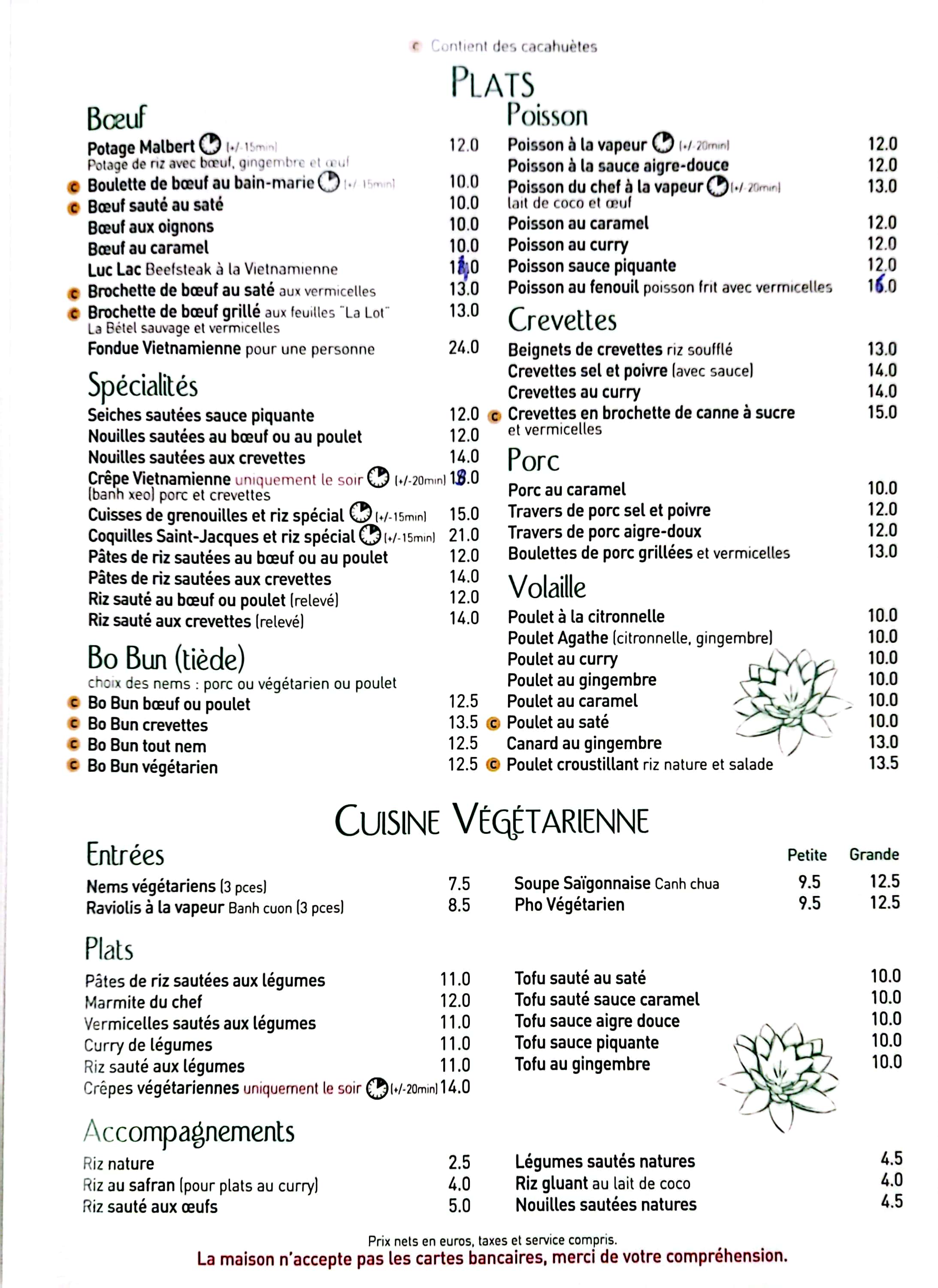 Restaurant qui ne prend pas la CB ! Goût des plats moyen : j'ai commandé un plat d'anguilles et j'ai eu 3 morceaux, de plus c'était trop sucré malgré la sauce au coco. Le boeuf loc-lac n'était pas mariné et la viande pas tendre. La peau des Bancun était trop épaisse et pas de pâté viet qui accompagnait juste du soja cru. Je n'y retournerai pas. Ce qui m'étonne c'est qu'il a une bonne réputation alors qu'à l'intérieur on est trop à l'étroit. Donc même pas cela pour rattraper le mauvais goût des plats :( J'ai mis 2 étoiles car le service était bien.