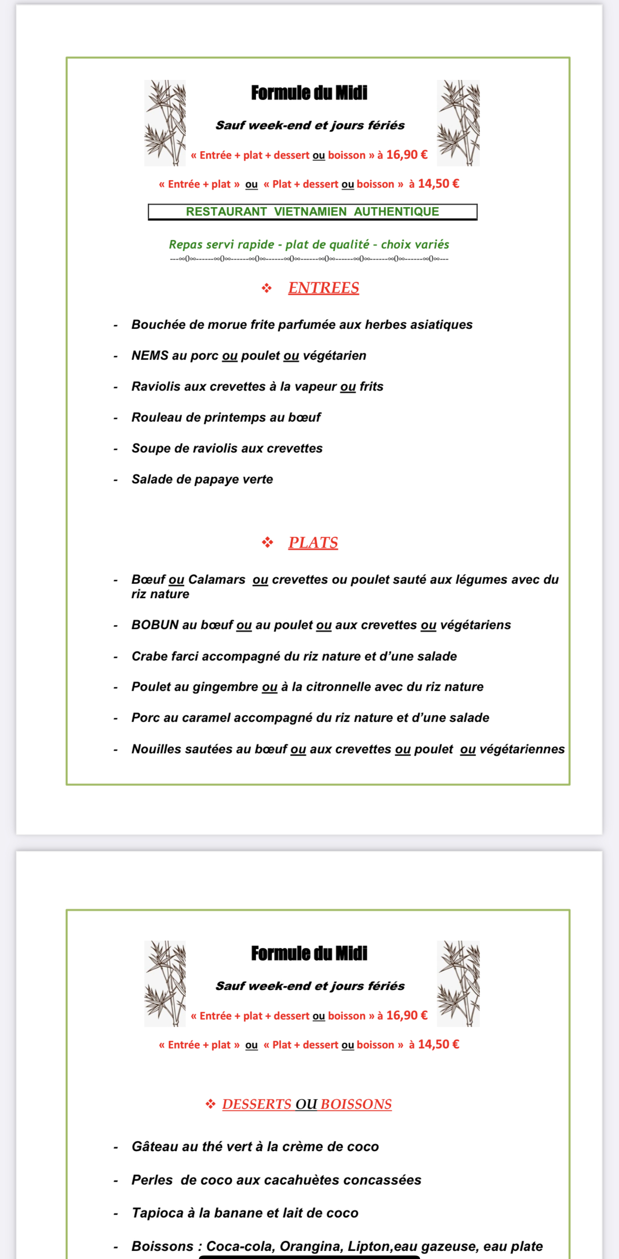 Posté le 03/09/2021 à 12:17"Excellente cuisine vietnamienne . Un accueil très chaleureux . J’ai commandé pour mon anniversaire un menu pour 14 personnes . Très bien conseillé et très touchée par les petites dégustations offertes pour me permettre d’orienter mon choix . Produits frais , parfaitement préparés pour une commande à emporter qui nous a tous régalée . Je recommande ."